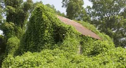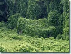 /Kudzu is a fast growing invasive species that snuffs out the plant life in its path. To folks’ dismay the plant that was imported for its usefulness, quickly covered everything in its path covering roads, cars, trees and buildings and killing off plant life by shading it from the light. It takes constant vigilance to keep it at bay.